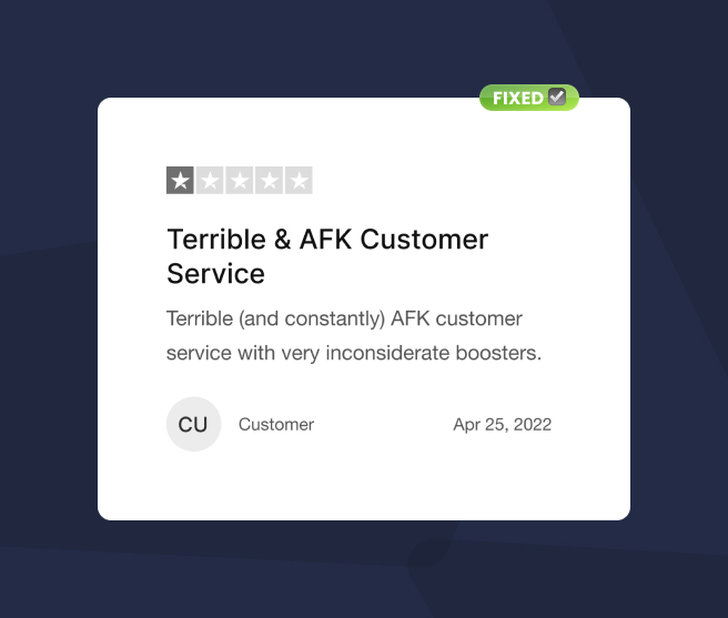 "Schrecklicher (und ständig) AFK-Kundenservice mit sehr rücksichtslosen Boostern." - https://www.trustpilot.com/reviews/6266ac697b2618e9fea56948